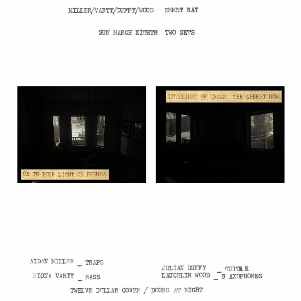 It will be two normal sets. I guess I’m the ‘leader’ (Aidan Miller) but it’s more of a group thing. Perhaps the title can just be our last names together if that isn’t too long. – Miller/Varty/Duffy/Wood. Style is rural/americana jazz.