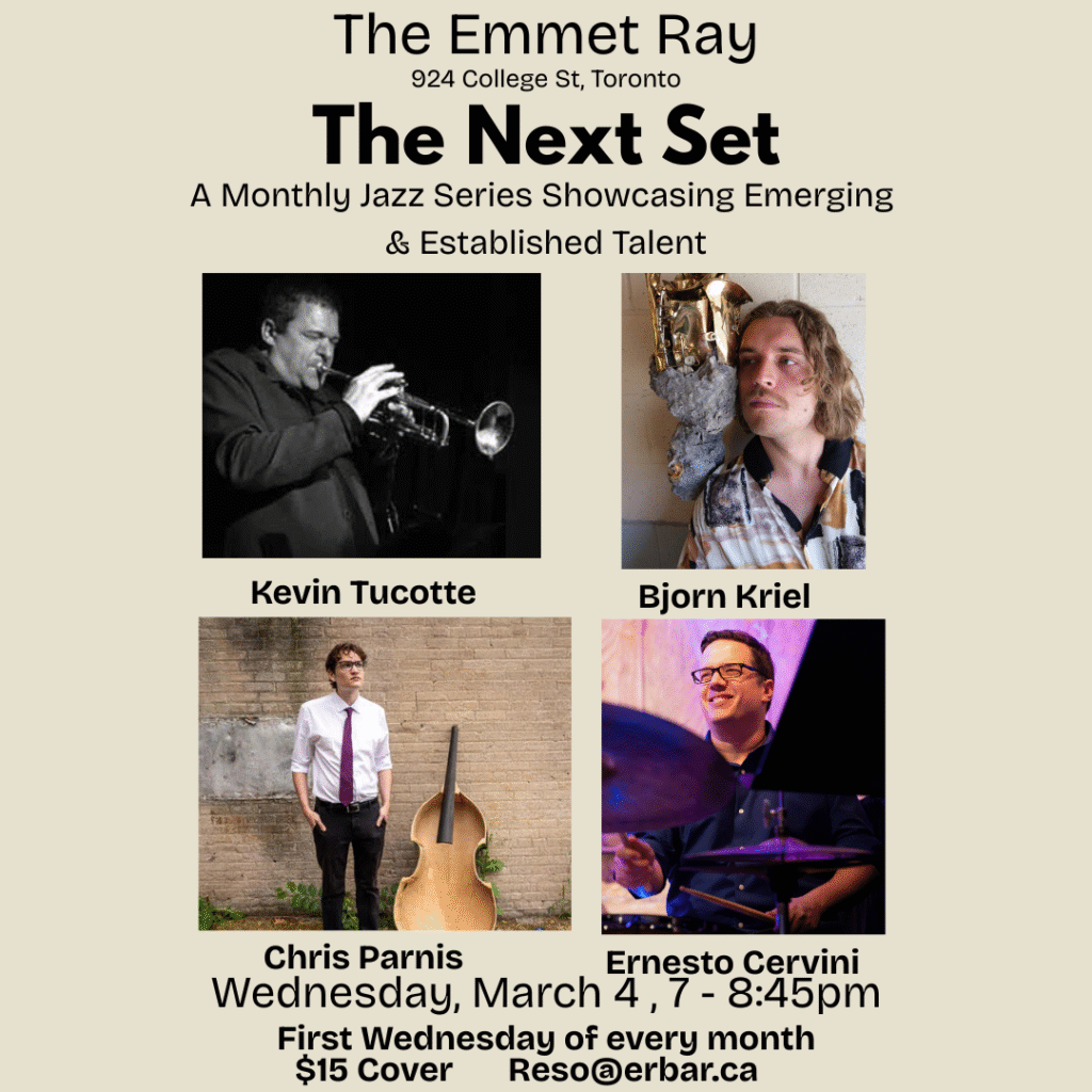 The Next Set returns on Wednesday, March 4th from 7–8:45pm with a powerful mix of experience and emerging artistry. Acclaimed trumpeter Kevin Turcotte joins forces with University of Toronto Master’s students Bjorn Kriel on vibraphone and Chris Parnis on bass, alongside Ernesto Cervini on drums. Expect original music, adventurous interplay, and the kind of creative risk-taking that defines this series—pairing Canada’s top improvisers with the next generation of voices.