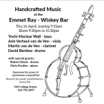 4 roommates reunite for a magical night of inebriant and live music. Come for an exuberant time where you can listen to these fine musicians play to their hearts content. The Emmet Ray offers a wide selection of whiskey and other spirits for your consumption.